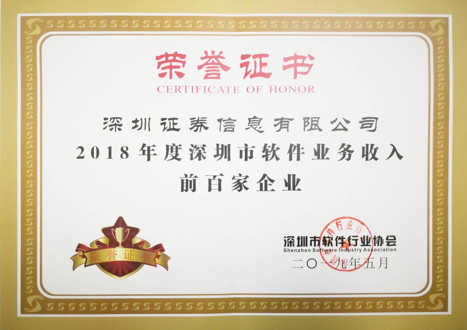 2019年5月,公司連續第9年獲深圳市軟件業(yè)務(wù)收入前百家企業(yè)榮譽(yù)。